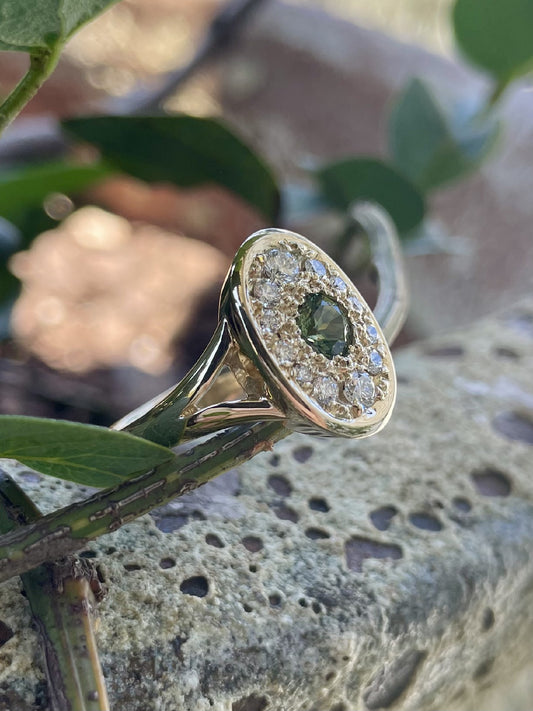 9ct Yellow Gold Green Sapphire & Diamond Oval Halo Ring