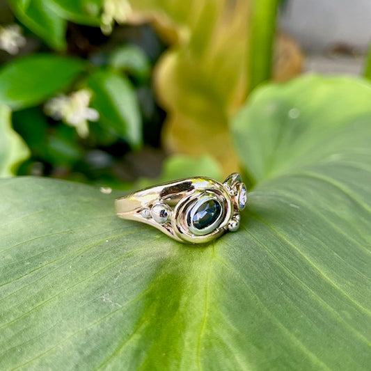 9ct Yellow and White gold, Blue Sapphire swirl ring