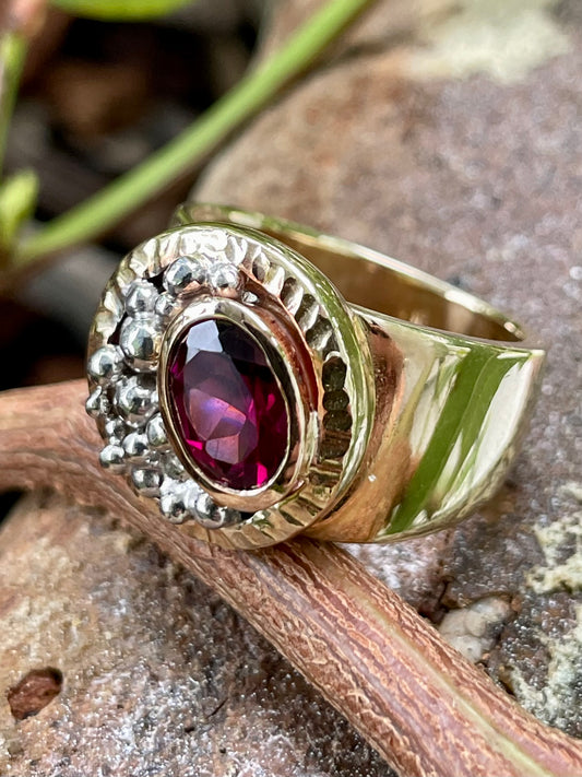 9ct Yellow, Rose and White Gold Rhodolite Garnet Ball Ring
