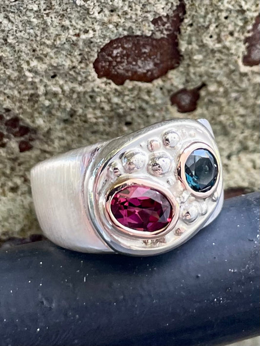 Sterling Silver and 9ct Rose Gold Rhodalite Garnet & London Blue Topaz Ball Ring