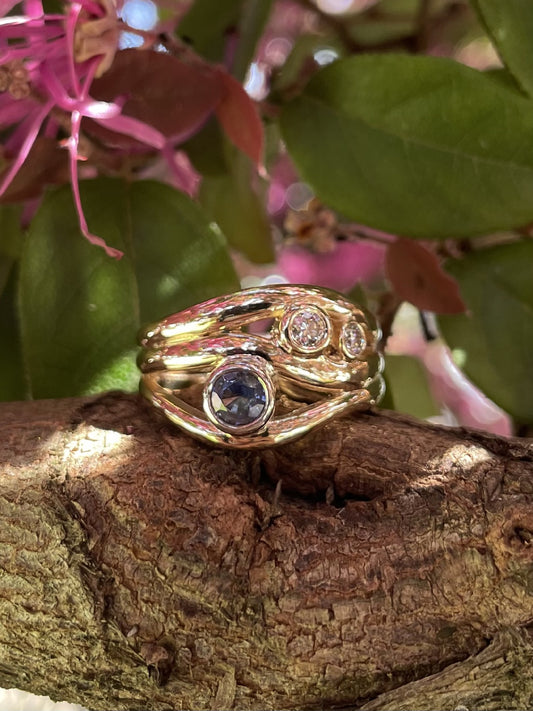 9ct Yellow Gold Ceylonese Sapphire & Diamond 'Wave' Ring