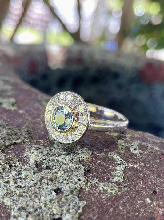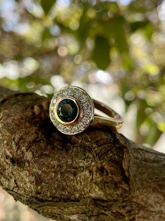 9ct Yellow/White Gold Teal Sapphire & Diamond 'Halo' Ring