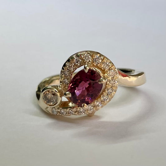 9ct Yellow Gold Pink Tourmaline, Diamond & Champagne Diamond Ring