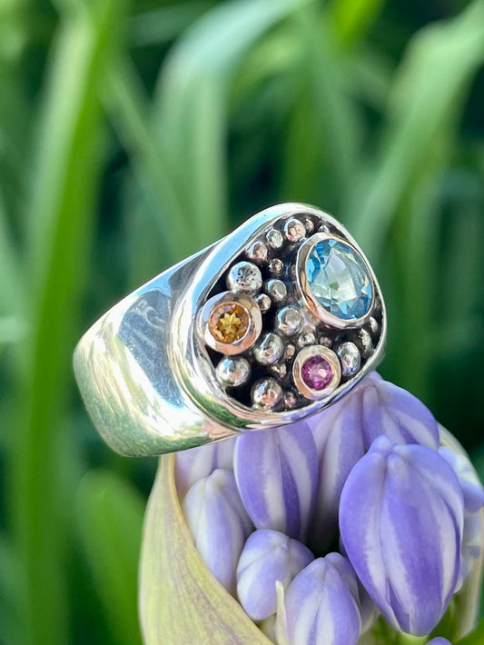 Sterling Silver & 9ct Rose Gold Blue Topaz, Rhodalite Garnet, Citrine Ball Ring