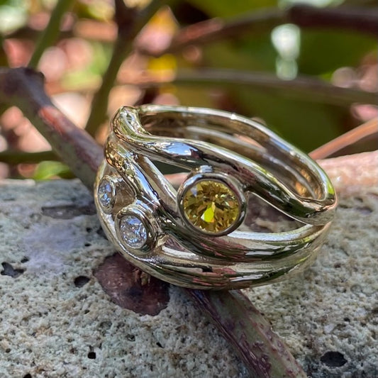9ct Yellow gold, Yellow Sapphire and diamond wave ring